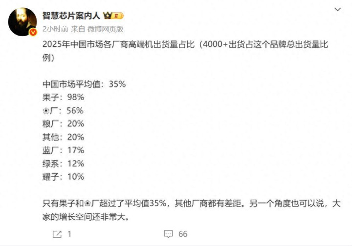 受益于国补的拉动,2025年国内高端手机占比有所提升,平均值为35%。苹果专注于高端手机市场,2025年高端手机占比高达98%。华为是国产手机中唯一超过50%的品牌,高端占比为56%,高出平均值20个百分点以上。粮厂在安卓阵营中确实领先,以20%的占比排名第三,vivo以17%的占比排名第四,OPPO以12%的占比排名第五,荣耀以10%的占比排名第六。