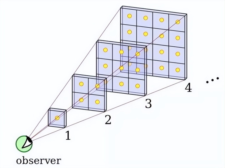 我们可以用一个简单的符号来表示这个恒定的亮度——假设在距离r处,所有恒星的总亮度为B。那么在距离2r处,单个恒星的视亮度会减弱为原来的1/4(因为距离平方增长),但恒星的数量会增加为原来的4倍(因为表面积平方增长),两者相乘,总亮度依然是B;在距离3r处,单个恒星视亮度减弱为1/9,恒星数量增加为9倍,总亮度还是B……以此类推,无论距离有多远,每一个“距离圈层”贡献的总亮度都是B。