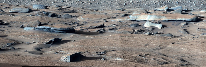 “毅力号”火星车正沿着内雷特瓦河谷向上游望去。这条古老的河谷在35亿多年前曾为耶泽罗陨石坑提供水源。前景中浅色的岩石是布莱特安吉尔组的细粒泥岩。(图源:NASA/JPL-Caltech/ASU/MSSS)