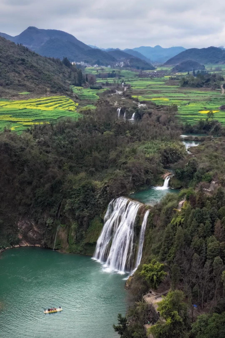 九龙瀑布从高空不错看到瀑布与油菜花和远方的山同框,这是它最经典的角度,不外走进了看也口舌常的颤动。