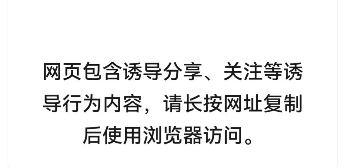 {jz:field.toptypename/}然而记者发现,6日中午时,千问红包二维码分享链接已被微信封禁。对于封禁理由,微信表示:“该网页包含诱导分享、关注等诱导行为内容,请长按网址复制后使用浏览器访问。”