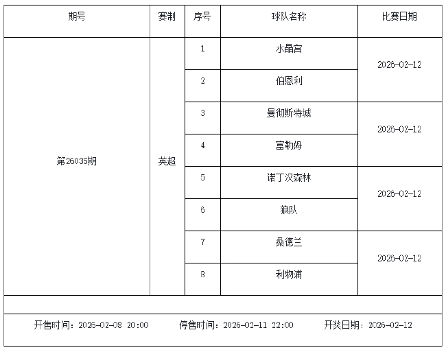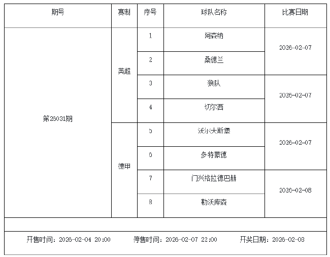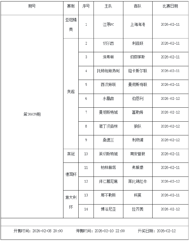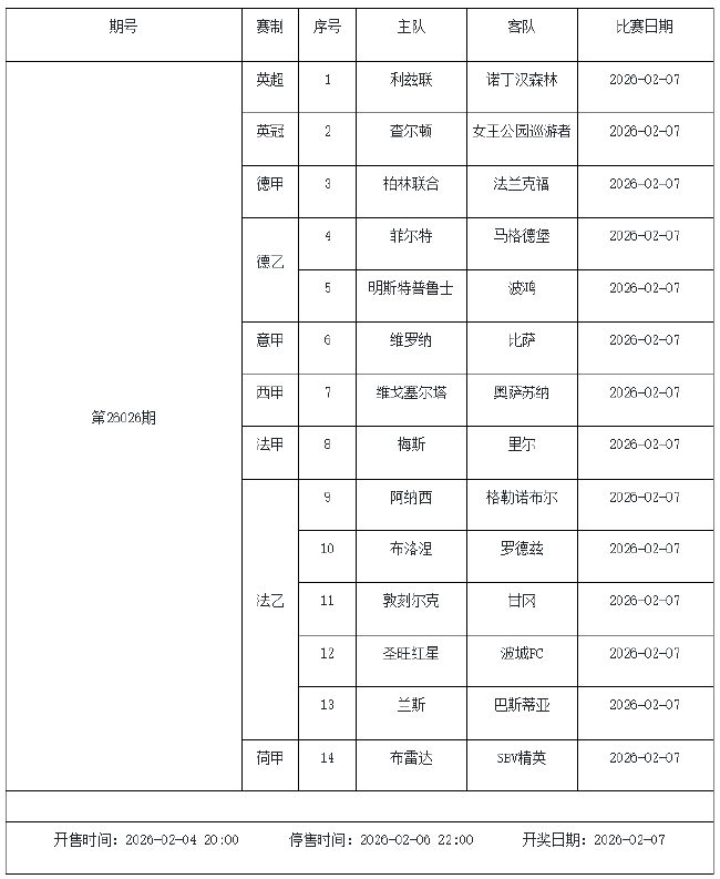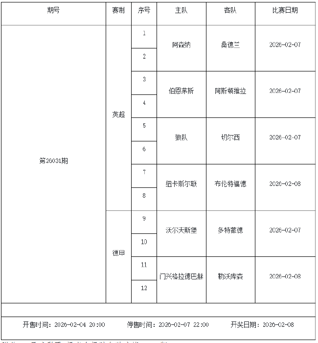 我中心制定了2026年中国足球彩票胜负游戏(14场、任选9场)、6场半全场胜负游戏和4场进球游戏2月6日-2月12日的竞猜场次安排(具体附后),其竞猜对象、开售时间、停售时间和计奖时间均以本文为准。