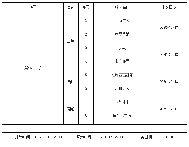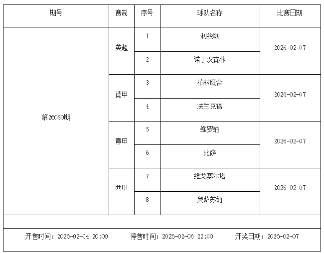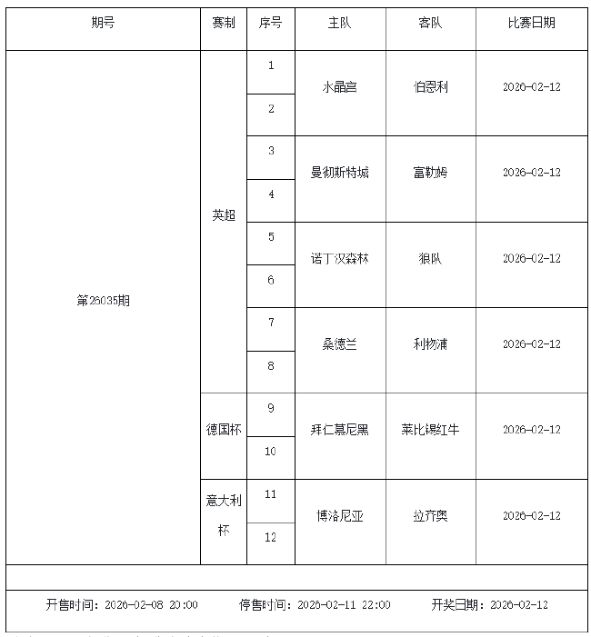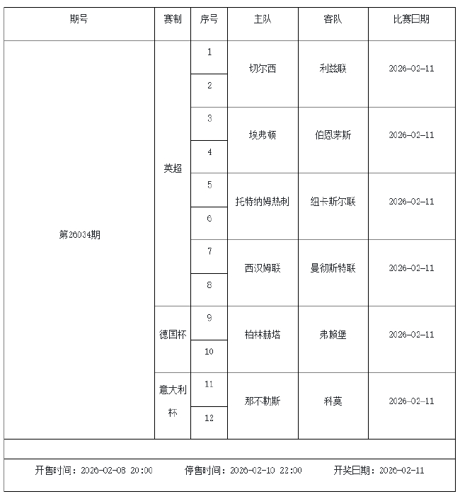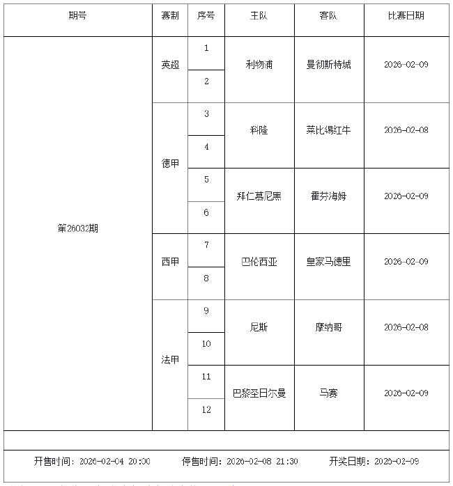 北京时间2026年2月3日,国家体彩中心公布了2026年2月6日-2月12日的足彩赛程,庄闲和米兰app2月6日(周五)、2月7日(周六)、2月8日(周日)、2月10日(周二)共4期。其中26026期竞猜有英超德甲等9大赛事混猜、第26027期、26028期由欧洲五大联赛组成、26029期竞猜亚冠英超英冠德国杯意大利杯。