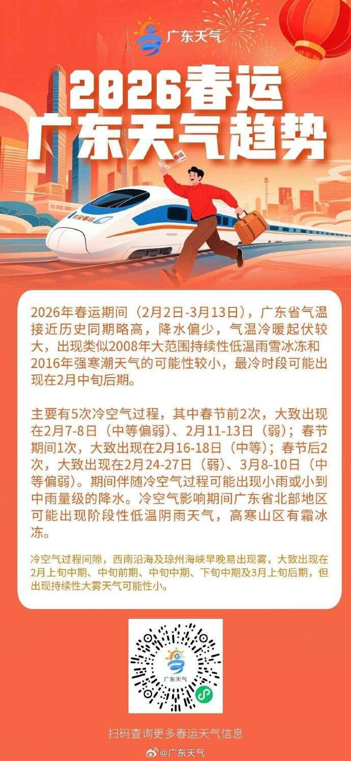 2026年春运期间,广东天气“剧本”基本出炉:气温接近历史同期略高,降水偏少。其间大约有5波冷空气到访,虽然气温会上演“过山车”戏码,但像2008年那种大范围持续性低温雨雪冰冻,或是2016年强寒潮天气的“极端剧情”,今年大概率不会上演。整体来看,天气对春运出行还是比较友好的。